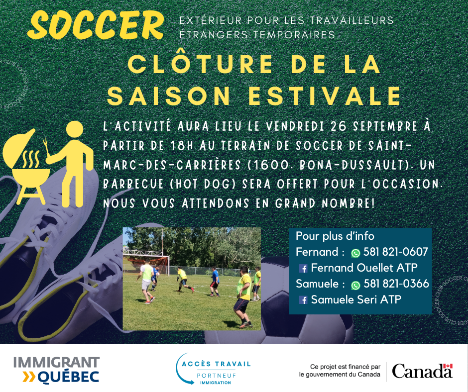 Val-des-Sources, QC/Outdoor soccer Val-des-Sources. 📍 Parc Du Centenaire, 517 1ere Avenue, Val-des-Sources, QC J1T 3X4, Canada 📅 july-19, - September 27- 2025 🕐 19h00-21h00 👉 This activity is intended for temporary foreign workers (with a closed work permit). Please follow the instructions shown on the event poster.