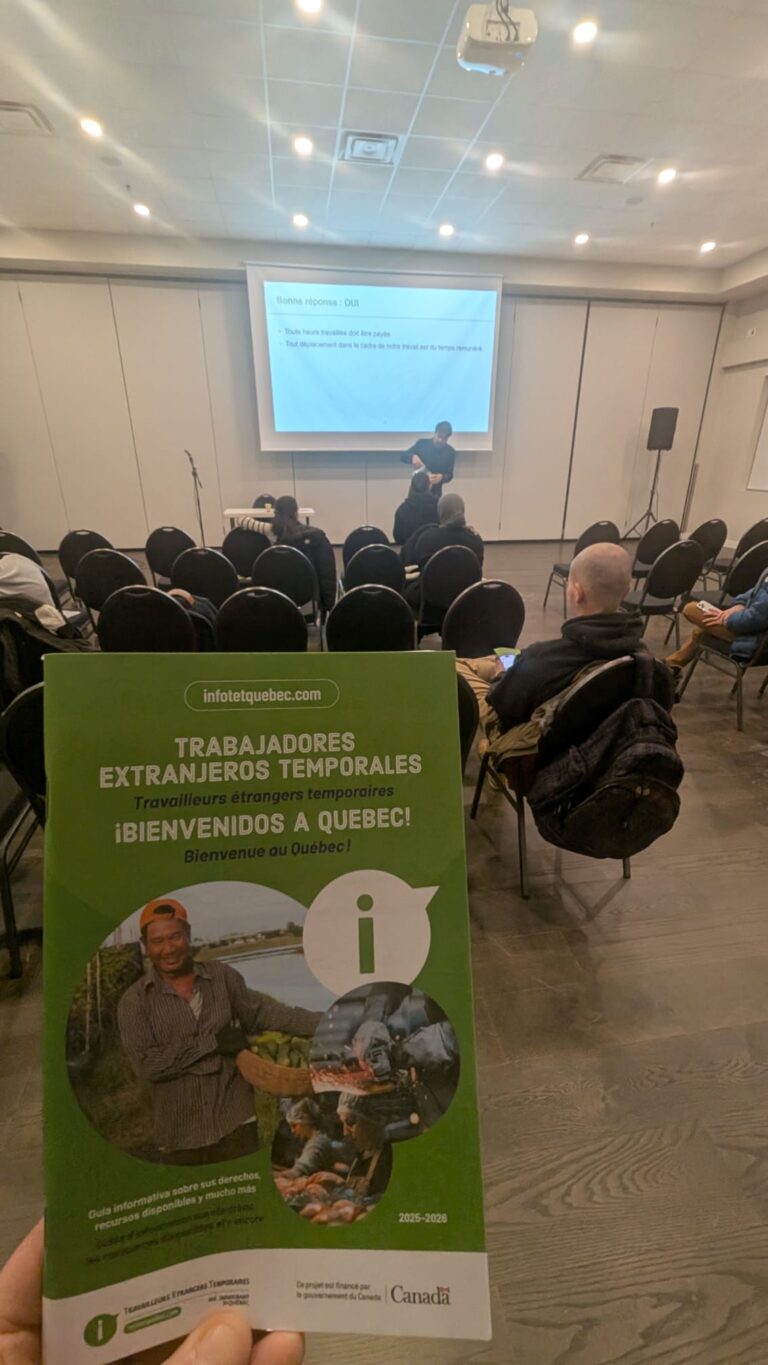 During the activity, Jonathan Buitrago, Regional Coordinator of nfoTET d’Immigrant Québec, took the opportunity to present the InfoTET Québec program and distribute the new edition of the information guide for TFWs, providing practical information and useful tools to better understand their rights, obligations, and available resources. This direct exchange allowed for questions to be answered, experiences to be heard, and the concrete needs of workers to be better understood, reinforcing nfoTET d’Immigrant Québec’s mission to provide clear and useful information to TFWs during their stay in the province.