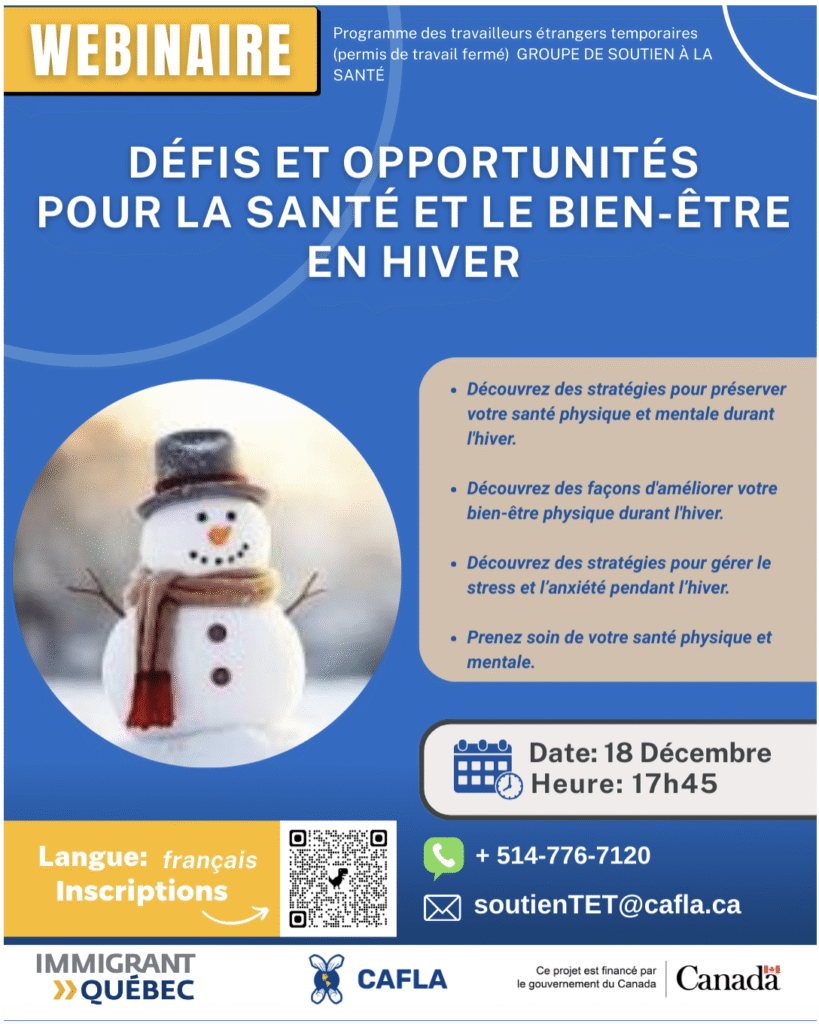 Don’t forget that on December 18, a webinar organized by the Centre d’aide aux familles latino-américaines (CAFLA), a PSTM organization, will cover the topic: Challenges and Opportunities for Health and Well-Being in Winter for Temporary Foreign Workers.