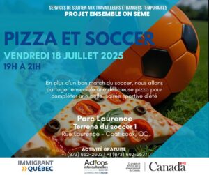 Coaticook, QC/Pizza and soccer 📍 Parc Laurence, Rue Laurence, Coaticook, QC J1A 1H8, Canada 📅 july-18, 2025 🕐 19h00-21h00 👉 This activity is intended for temporary foreign workers (with a
