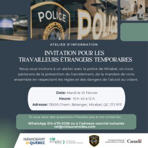 Mirabel, QC / Informational Workshop by the Mirabel Police for TFWs 📍 13000 Chem. Bélanger, Mirabel, QC J7J 1P3, Canada📅 February 10, 2026🕐 10:45 AM – 12:00 PM We will