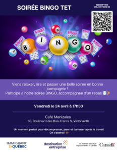 Victoriaville, QC / Bingo Night for TFWs 📍60 South Bois-Francs Boulevard, Victoriaville, Quebec, Canada📅 April 24, 2026🕐 5:30 PM – 7:30 PM A friendly bingo night for Temporary Foreign Workers