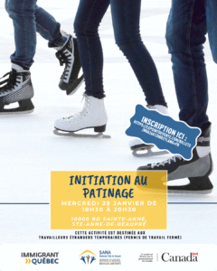 Sainte-Anne-de-Beaupré, QC / Skating Initiation for TFWs 📍 10000 Bd Sainte-Anne, Sainte-Anne-de-Beaupré, QC G0A 3C0📅 January 28, 2026🕐 6:30 p.m. – 8:30 p.m. Skating lessons for newcomers to learn the