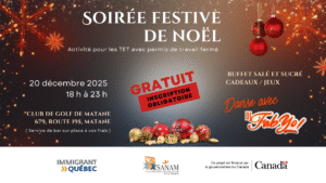 Matane, QC/ Festive Christmas party for TFWs 📍679 Route 195, Matane, QC. 📅 20-december-2025 🕐 18h00-23h00 👉 This activity is intended for temporary foreign workers (with a closed work permit).