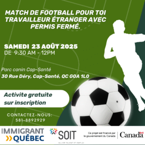 Cap-Santé, Qc./Soccer game for TET 📍 Parc canin Cap-Santé, 30 Rue Déry, Cap-Santé, QC G0A 1L0, Canada 📅 23-august-2025 🕐 09h30-12h00 👉 This activity is intended for temporary foreign