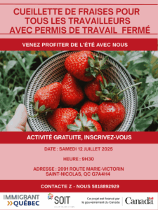 Saint-Nicolas, QC / STRAWBERRY PICKING FOR TFWs 📍 2091 Rte Marie-Victorin, Saint-Nicolas, QC G7A 4H4, Canada 📅 July-12, 2025 🕐 09h30 👉 This activity is intended for temporary foreign workers