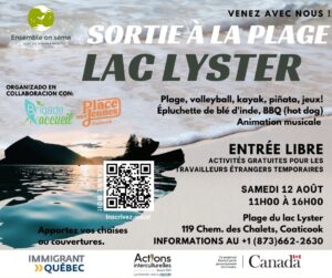 VENGAN CON NOSOTROS AL PICNIC Y ACTIVIDAD NÁUTICA AL LAC BOIVIN Acceso a kayak, cannot, paddle, juegos y picnic ENTRADA LIBRE ACTIVIDADES GRATUITAS PARA TRABAJADORES EXTRANJEROS TEMPORALES DOMINGO 27 AGOSTO 10:00 AM A
