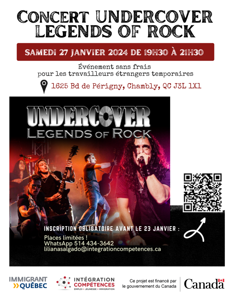 SAMEDI 27 JANVIER 2024 DE 19H30 À 21H30 Événement sans frais pour les travailleurs étrangers temporaires 1625 Bd de Périgny, Chambly, QG J3L 1X1 INSCRIPTION OBLIGATOIRE AVANT LE 23 JANVIER Places limitées ! WhatsApp 514 434-3642 lilianasalgado@integrationcompetences.ca